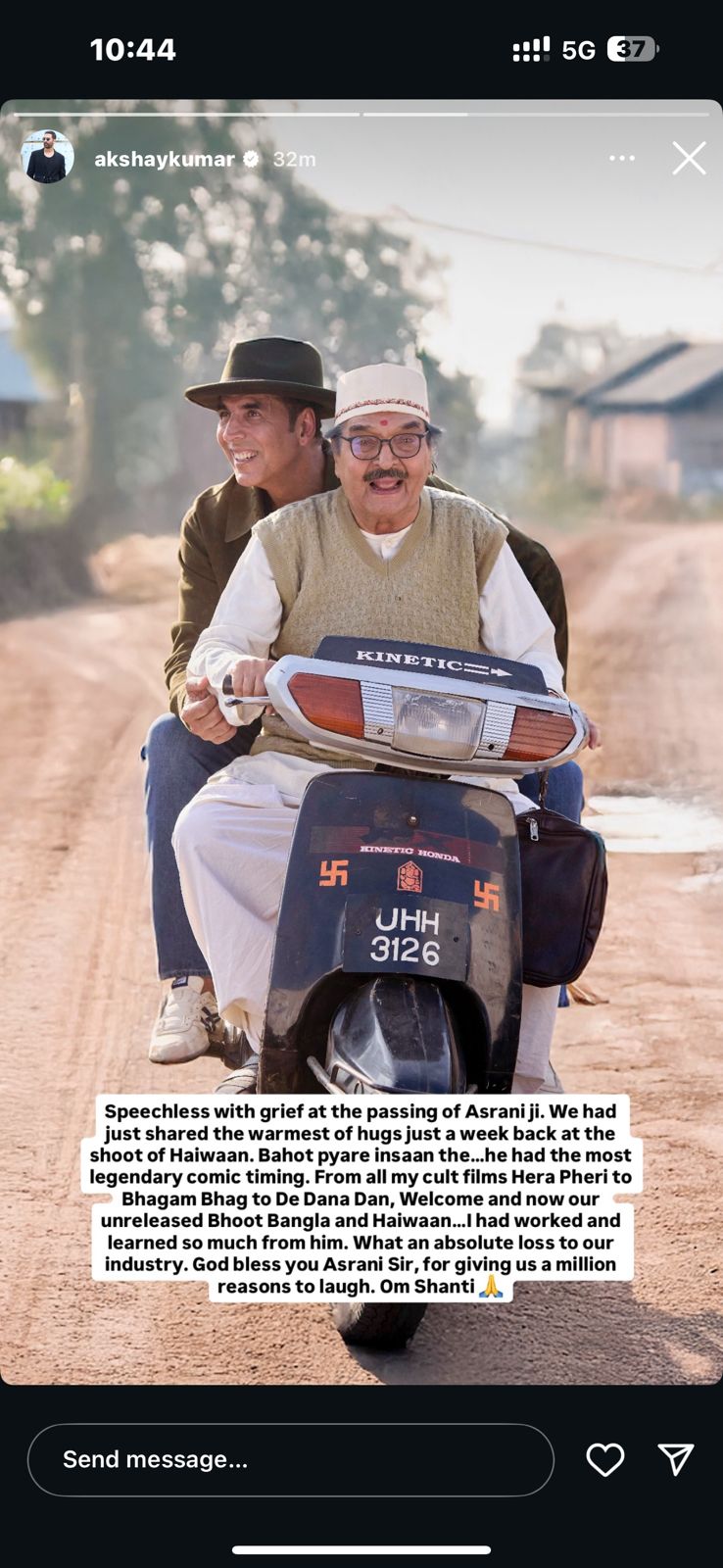 ਵੀਓਪੀ ਬਿਊਰੋ – ਬਾਲੀਵੁੱਡ ਤੋਂ ਦੀਵਾਲੀ ਮੌਕੇ ਇੱਕ ਬਹੁਤ ਹੀ ਮੰਦਭਾਗੀ ਖਬਰ ਸਾਹਮਣੇ ਆਈ ਹੈ। ਆਪਣੀ ਸਾਰੀ ਉਮਰ ਫਿਲਮਾਂ ਵਿੱਚ ਅਭਿਨੈ ਕਰਦੇ ਹੋਏ ਲੋਕਾਂ ਨੂੰ ਹਸਾਉਣ ਵਾਲੇ ਮਸ਼ਹੂਰ ਕਾਮੇਡੀ ਕਲਾਕਾਰ ਅਸਰਾਨੀ ਦਾ ਦੇਹਾਂਤ ਹੋ ਗਿਆ ਹੈ। ਦੀਵਾਲੀ ਵਾਲੇ ਦਿਨ ਇਸ ਮੰਦਭਾਗੀ ਖਬਰ ਨਾਲ ਬਾਲੀਵੁੱਡ ਵਿੱਚ ਸੋਗ ਦੀ ਲਹਿਰ ਹੈ। ਖਿਡਾਰੀ ਕੁਮਾਰ ਅਕਸ਼ੈ ਕੁਮਾਰ ਨੇ ਵੀ ਅਸਰਾਨੀ ਦੀ ਮੌਤ ‘ਤੇ ਦੁੱਖ ਦਾ ਪ੍ਰਗਟਾਵਾ ਕੀਤਾ ਹੈ।