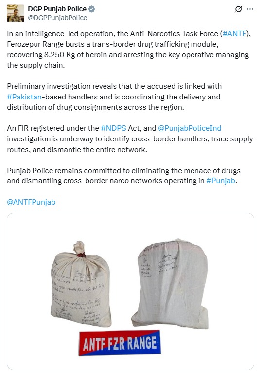 ਡੀਜੀਪੀ ਪੰਜਾਬ ਨੇ ਟਵੀਟ ਕੀਤਾ, “ਖੁਫੀਆ ਜਾਣਕਾਰੀ ਦੀ ਅਗਵਾਈ ਹੇਠ ਇੱਕ ਕਾਰਵਾਈ ਵਿੱਚ, ਫਿਰੋਜ਼ਪੁਰ ਰੇਂਜ ਦੀ ਐਂਟੀ-ਨਾਰਕੋਟਿਕਸ ਟਾਸਕ ਫੋਰਸ ਨੇ ਇੱਕ ਸਰਹੱਦ ਪਾਰ ਨਸ਼ਾ ਤਸਕਰੀ ਮਾਡਿਊਲ ਦਾ ਪਰਦਾਫਾਸ਼ ਕੀਤਾ, 8.250 ਕਿਲੋਗ੍ਰਾਮ ਹੈਰੋਇਨ ਬਰਾਮਦ ਕੀਤੀ ਅਤੇ ਸਪਲਾਈ ਚੇਨ ਦਾ ਪ੍ਰਬੰਧਨ ਕਰਨ ਵਾਲੇ ਮੁੱਖ ਸੰਚਾਲਕ ਨੂੰ ਗ੍ਰਿਫਤਾਰ ਕੀਤਾ।
