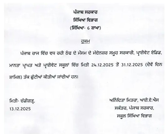 ਅਧਿਕਾਰੀ ਨੇ ਸਪੱਸ਼ਟ ਕੀਤਾ ਕਿ ਲਿਖਤੀ ਸ਼ਿਕਾਇਤ ਮਿਲਣ ‘ਤੇ, ਤੱਥਾਂ ਦੇ ਆਧਾਰ ‘ਤੇ ਸਬੰਧਤ ਸਕੂਲ ਵਿਰੁੱਧ ਢੁਕਵੀਂ ਕਾਰਵਾਈ ਕੀਤੀ ਜਾਵੇਗੀ। ਜ਼ਿਲ੍ਹਾ ਸਿੱਖਿਆ ਅਫ਼ਸਰ ਰਾਜੇਸ਼ ਸ਼ਰਮਾ ਨੇ ਦੱਸਿਆ ਕਿ ਪੰਜਾਬ ਸਰਕਾਰ ਨੇ 24 ਦਸੰਬਰ ਤੋਂ 1 ਜਨਵਰੀ ਤੱਕ ਸਰਦੀਆਂ ਦੀਆਂ ਛੁੱਟੀਆਂ ਦਾ ਐਲਾਨ ਕੀਤਾ ਹੈ।